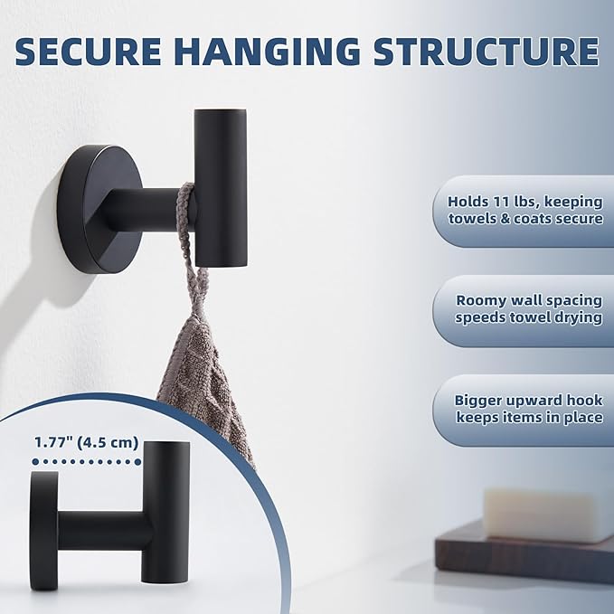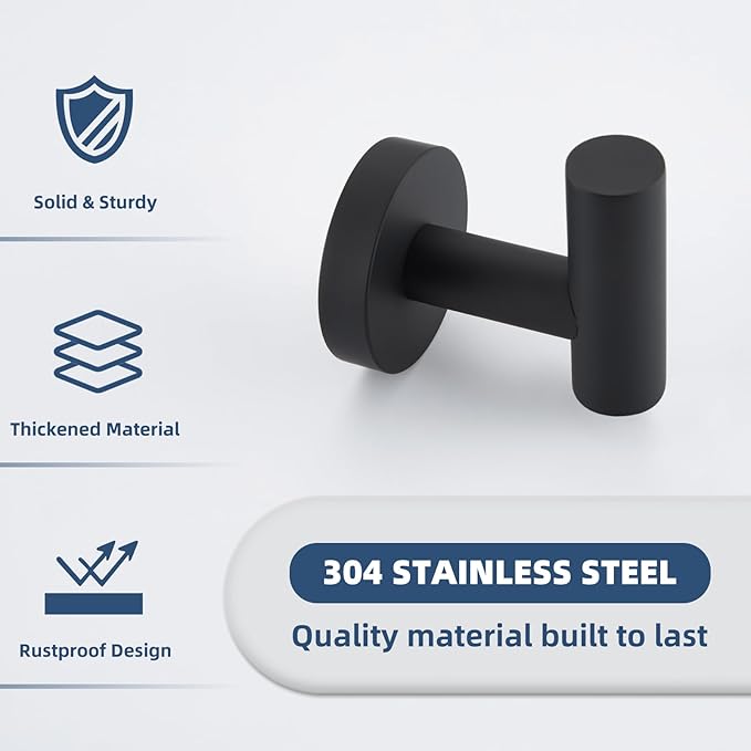 - PREMIUM MATERIAL TOWEL HOOK: crafted from 304 stainless steel, matte black clothes hook has smooth baked finish with no sharp edges, gentle on fabrics. It passes 48-hour salt spray test, meets strict export standards. Ensuring long-lasting aesthetic appeal & rust proof