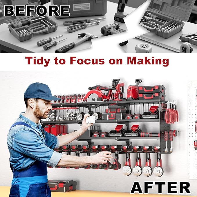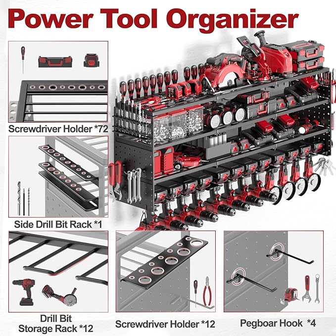 - Order in the Garage: This wall-mounted drill holder can hold more than 50 tools, transforming cluttered garages into organized havens.You no longer need to waste time searching for tools, cordless tool organizer for warehouse, garages, workshops,pegboards,backyard shops, sheds, and more