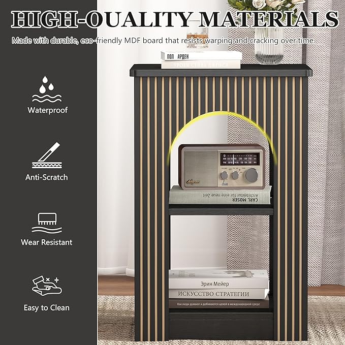 End Table with 3-Tier Storage, Mid-Century Modern Side Table with Arched Carving Lines, Square Fluted Nightstand Accent Table for Living Room, Bedroom, or Office (1, Black)