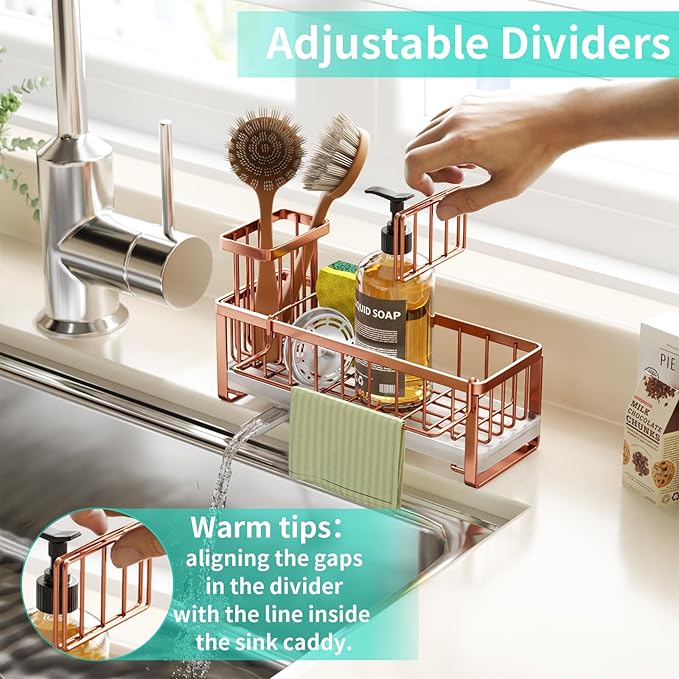 HapiRm Sponge Holder for Kitchen Sink - Self-draining Sink Caddy with Brush and Dishcloth Holders, Stainless Steel Kitchen Organizer for Countertop - Rose Gold