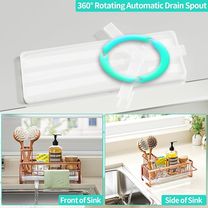 - [360° Rotating Drainage]: Tired of waterlogged counters? The 360° rotating drainage pipe on our sink caddy ensures your kitchen stays dry and clean, effortlessly directing water into the sink. The drain pipe is removable, so you can remove it for cleaning