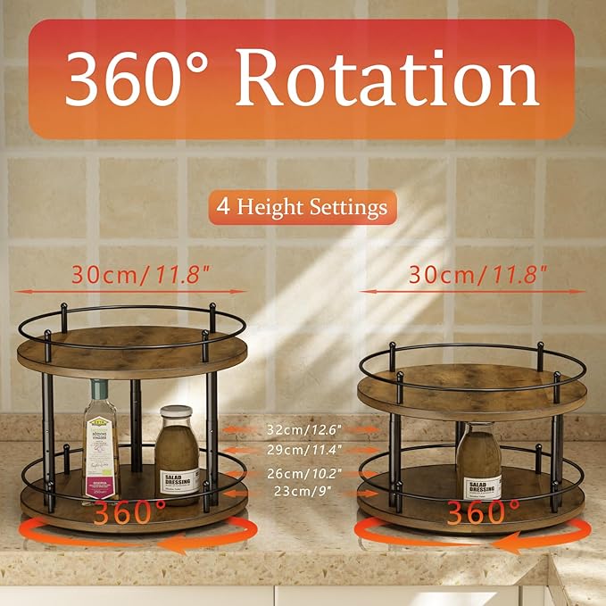 - 【Quality Materials】This 2-Tier Lazy Susan Organizer is made of vintage solid wood and metal and is very sturdy and durable. Unlike ordinary wood, it has a special coating that makes it waterproof and heat-resistant, so it can be used in a variety of scenarios and is much easier to clean.