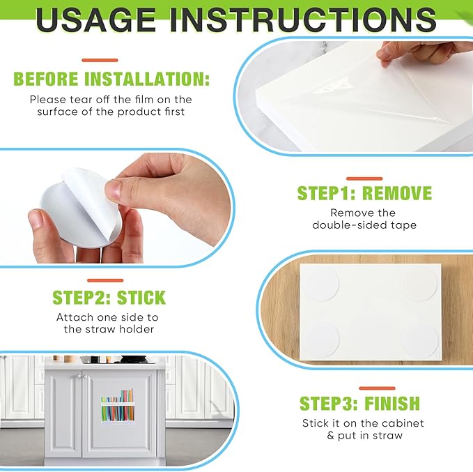 - Complete Package for Easy Installation: the package includes 1 acrylic straw holder and 4 pieces of double sided adhesive tapes (straw not include); The tapes provide a secure and stable setup, ensuring the straw holder stay securely even in busy areas; The outer layer of the product has a plastic film and auxiliary tape; The plastic film needs to be torn off before use; The tape is applied to assist in fixing the product and can also be torn off without affecting the stability of the product