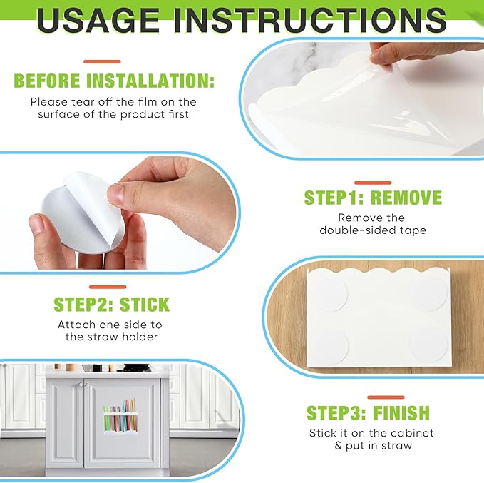 - Complete Package for Easy Installation: the package includes 1 acrylic straw holder and 4 pieces of double sided adhesive tapes (straw not include); The tapes provide a secure and stable setup, ensuring the straw holder stay securely even in busy areas; The outer layer of the product has a plastic film and auxiliary tape; The plastic film needs to be torn off before use; The tape is applied to assist in fixing the product and can also be torn off without affecting the stability of the product
