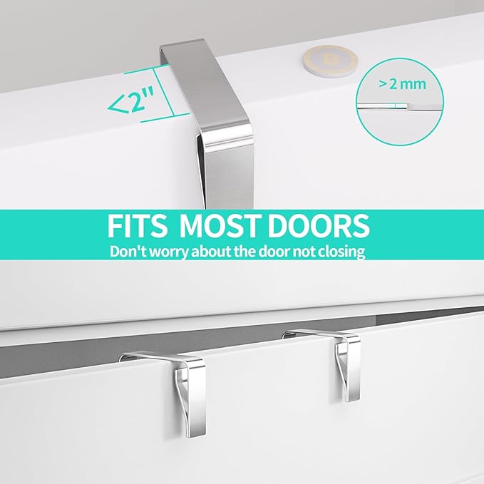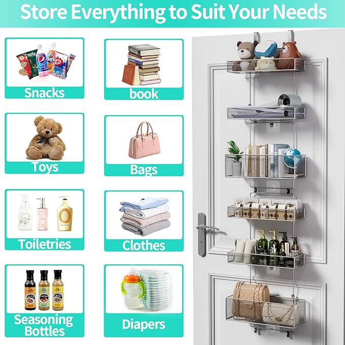 - [Multifunctional Door Rack Organizer]: Versatility meets functionality with the door hanger organizer. Whether you need extra storage in the bathroom, kitchen, bedroom, or laundry room, this multifunctional over door storage organizer adapts to your needs. Use back of door storage to store bath products, cleaning supplies, pantry items, cosmetics, towels, dolls, bags, baby products, snacks, bottles, spice bottles or accessories, within arm's reach, making it a practical addition to any room in your home