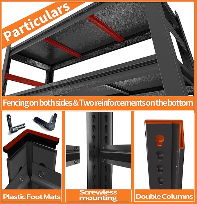 - 【3500LBS Metal Storage shelves】This metal garage shelving is made of high-quality thickened cold-rolled steel, with a hardness increase of 30% compared to ordinary steel. The double-layer column design greatly improves the stability and load-bearing capacity of the storage shelves, with a comprehensive load-bearing capacity of up to 3500LBS and a load-bearing capacity of 700LBS per layer