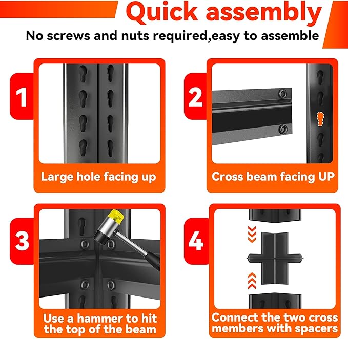 - 【10-Minute Easy Assembly & Thoughtful Service】No nuts or bolts needed—effortlessly assemble each standalone garage shelf in minutes! To simplify setup, we include a hammer and gloves. Plus, enjoy 24/7 customer support with every purchase. If any parts are damaged or missing, contact us for a swift resolution within 24 hours