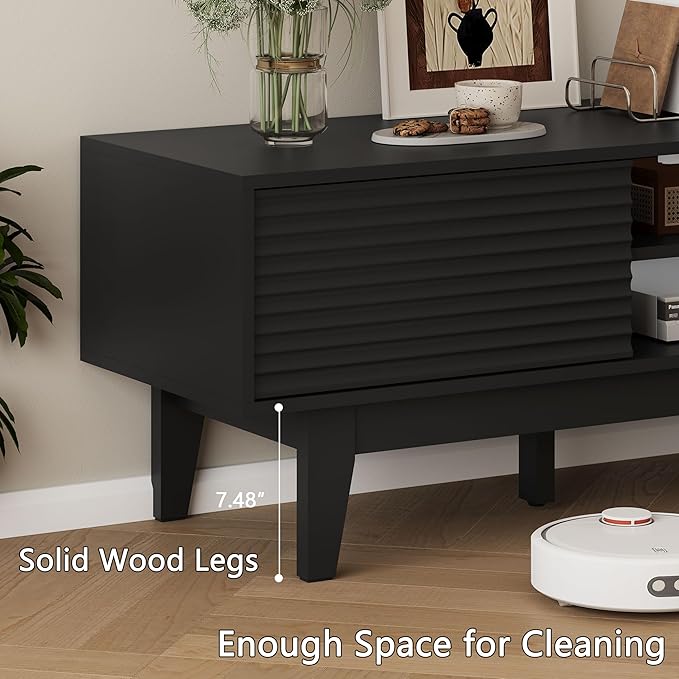 Fluted TV Stand for 55 65 Inch TV, Mid Century Modern Entertainment Center with Shelves, Cabinets & Sliding Doors, TV Media Console Table with Wood Feet & Cord Holes for Living Room, Bedroom, Black