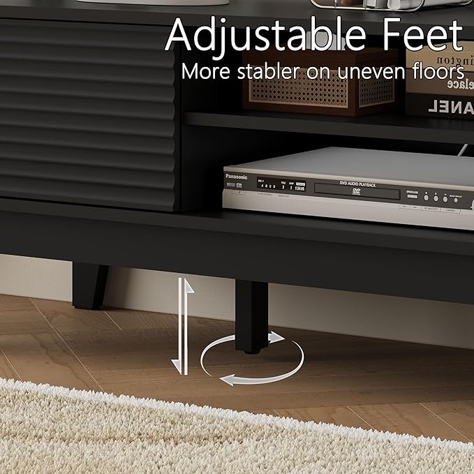 - 【Sturdy Structure & Adjustable Feet】Well constructed with P2 board and laminated MDF, the TV console is of great stability and durability, load-bearing for the top up to 175 lbs. The 6 solid wood feet give this television stand a strong support. Besides, 2 middle feet can be adjustable to keep balance on uneven floor