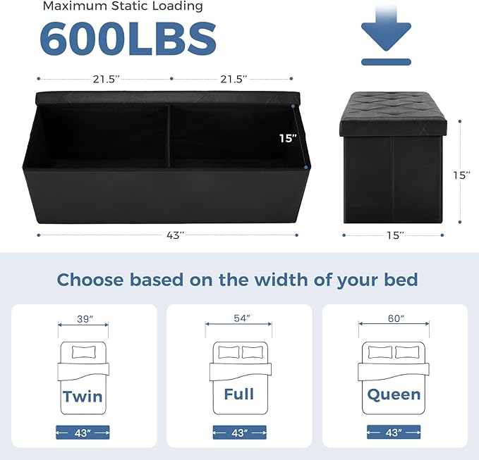 - 【Roomy Storage】: Measuring 15"D x 15"H x 43"W, this storage ottoman offers a spacious 35-gallon (154L) capacity. It comes with a center divider to separate items on both sides, ideal for organizing cosmetics, books, snacks, and more. The divider also reinforces the top for extra durability.