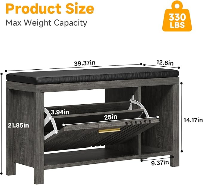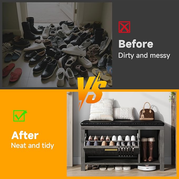 - Hidden Storage: This shoe bench combines a comfortable sitting bench with essential shoe storage (flip-down bins & open shelving) in a compact 39.4" x 12.6" x 21.5" footprint, perfect for organized entryways, hallways, or mudrooms, which keeps your home tidy, adds a touch of elegance and saves space.