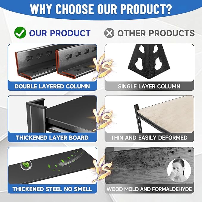 - 【3500LBS Metal Storage shelves】This metal garage shelving is made of good-quality thickened cold-rolled steel, with a hardness increase of 30% compared to ordinary steel. The double-layer column design greatly improves the stability and load-bearing capacity of the storage shelves, with a comprehensive load-bearing capacity of up to 3500LBS and a load-bearing capacity of 700LBS per layer