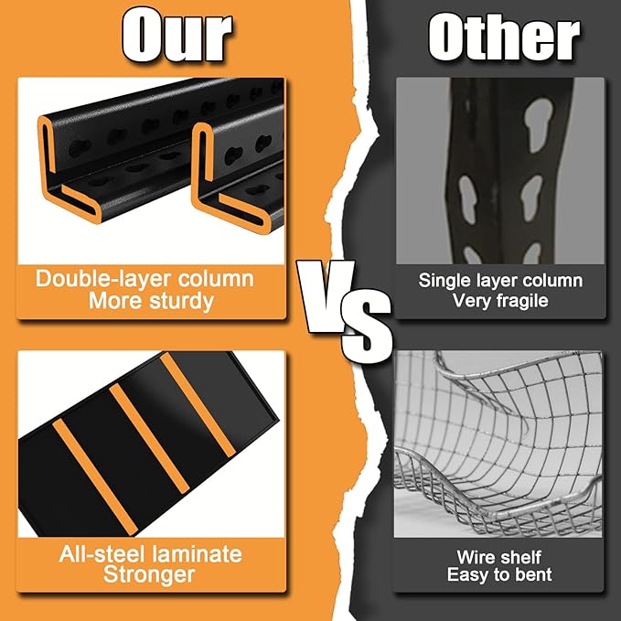 - 【Double-layered Pegboard Design】The garage shelving units features double-layered steel pegboard posts + extra-wide crossbars for impact-resistant shelving. Thickened steel shelves support bulky tool storage, storage bins, and retail merchandise—perfect for warehouse racks, shop shelving, and commercial storage solutions