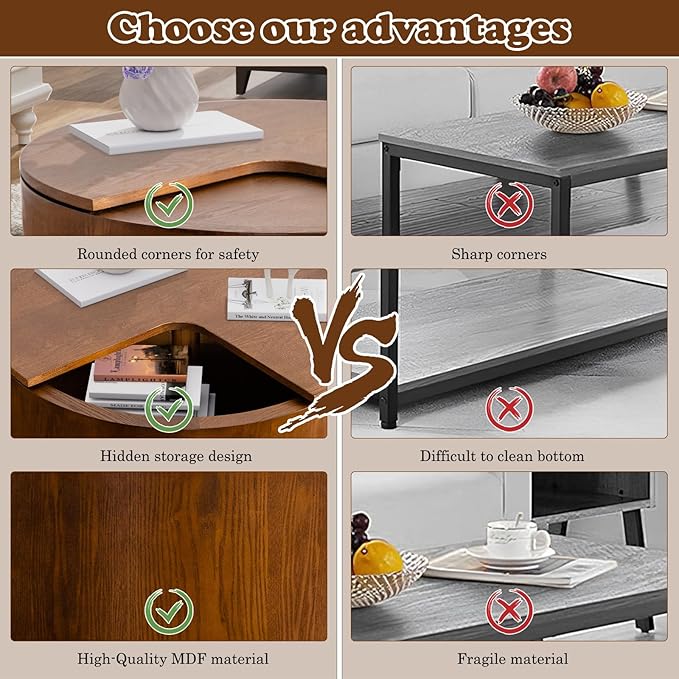 - Rotating-Top Hidden Storage: Easily rotating-top design to reveal a spacious hidden compartment for books, remote controls, and daily essentials. This round storage coffee table keeps your living space neat while offering quick access to everything you need. Perfect for storing magazines, blankets, or board games, this circle coffee table maximizes storage in compact spaces.