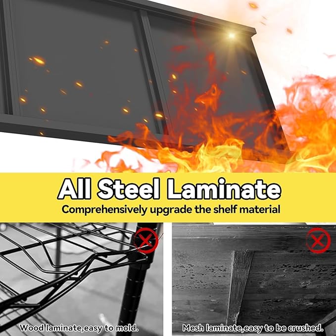 - 【Garage Shelving with 2000LBS Capacity】This metal storage rack shelf organizer is made of high-quality thickened cold-rolled steel, unlike traditional wooden shelves that are prone to deformation, moisture damage, and deterioration. Its heavy-duty steel frame and reinforced crossbeam structure provide additional support, with each shelf capable of holding 400 pounds and a total load capacity of 2000 pounds