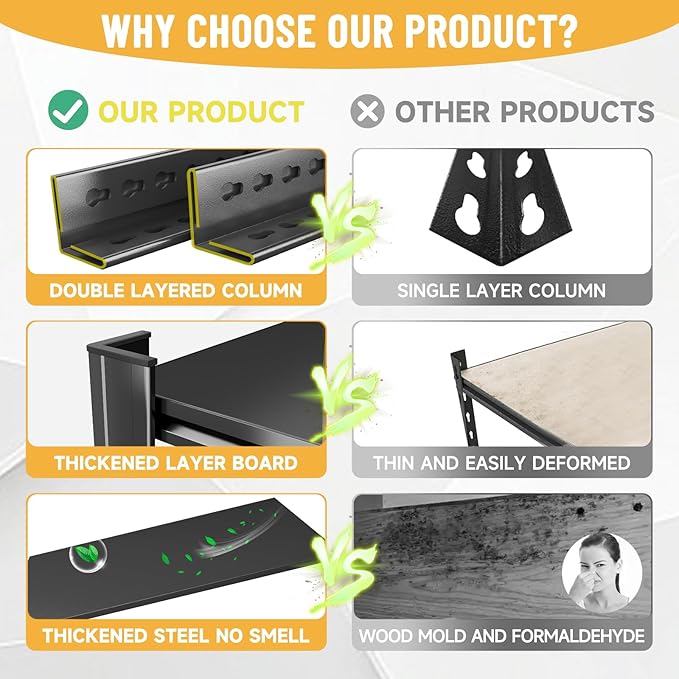 - 【Upgraded double-layer columns for improved stability】Safer and more robust rolled edge design, eliminating the low quality and easy scratching issues commonly found in single-layer shelves on the market. This metal garage shelving units is made of industrial-grade metal with a rolled edge design. The metal garage storage shelves columns are not only thicker and of higher quality, but also effectively protect your hands from scratches